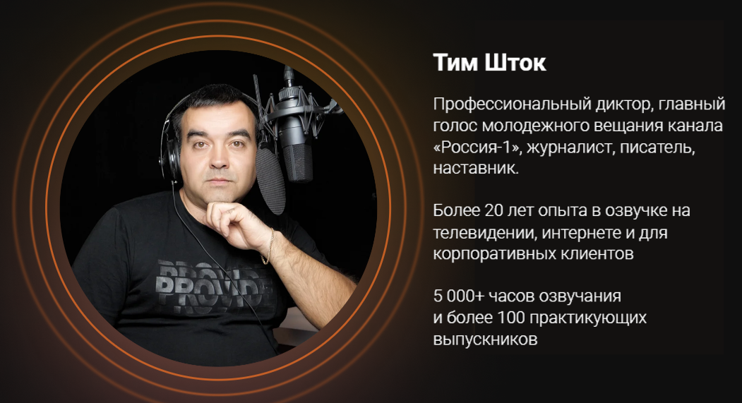 На бесплатном уроке вы познакомитесь с профессиональным диктором — главным голосом молодёжного вещания канала «Россия‑1», журналистом, писателем и наставником. У него более 20 лет опыта работы на телевидении, в интернете и с корпоративными клиентами.